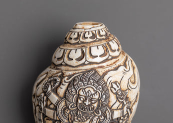This hand-carved Six Armed Mahakala Conch is a wonderful example of Tibetan artistry and commitment. This sacred conch shell, measuring 17cm in height and 10cm in breadth and weighing 0.60kg, bears an elaborately hand-carved image of Mahakala, the fearsome guardian deity known for his six arms, which represent the six perfections that lead to enlightenment. The intricate carvings show Mahakala in a dynamic pose, exuding protecting force and eliminating negativity. In Tibetan Buddhism, the conch represents the awakening sound of Dharma, which calls creatures to spiritual knowledge and compassion.