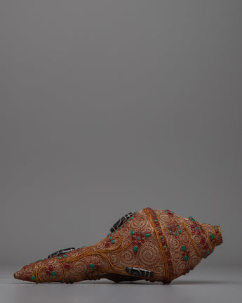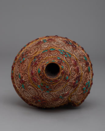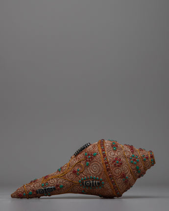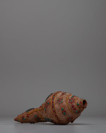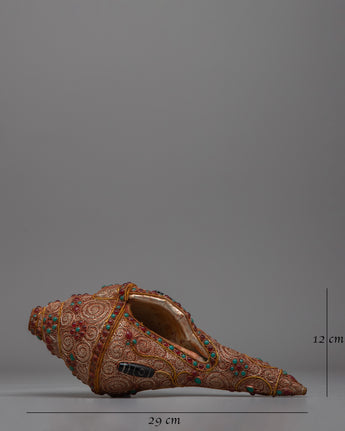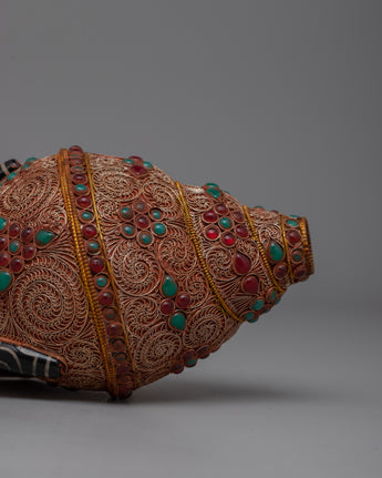 Handcrafted Silver-Plated Ritual Conch Shell with Coral and Turquoise, Sacred Meditation and Altar Decor combine elegance and gratitude. It is made of copper and features stunning filigree work as well as present artificial stones such as coral and turquoise. This conch shell, measuring 12 cm in height and 29 cm in width, makes an excellent addition to meditation altars, sacred spaces, or as an impressive piece in home design. Its spiritual importance in Tibetan Buddhism as a Dharma symbol makes it a valuable treasure among those seeking calmness and enlightenment.