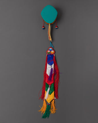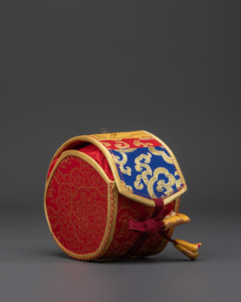 The drum is decorated with vibrant ribbons and colorful woolen beaters, and it comes with a stunning silk brocade case (0.12kg) for safe storage and ceremonial purposes. The brocade cover features traditional Tibetan motifs, making it suitable for both display and daily use. This ritual drum is lightweight and portable, making it ideal for practitioners, spiritual collectors, and as a thoughtful gift.