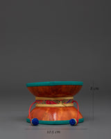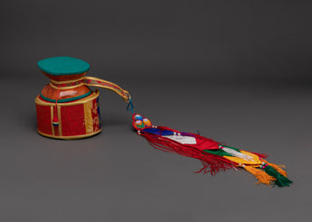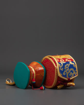 A Chod drum, integral to the Chod spiritual practice in Tibetan Buddhism, is a unique and symbolic instrument. Also known as a damaru, this small, double-sided hand drum features a narrow waist that connects two drumheads. The drum's shape is often likened to the hourglass, embodying the union of wisdom and compassion. Used by Chod practitioners during ritualistic ceremonies, the drum's rhythmic beating is believed to connect with the sacred energies, facilitating meditation and the realization of emptiness. The Chod drum, with its ritualistic role, underscores the synthesis of sound, spirituality, and meditation in Tibetan Buddhist traditions.