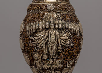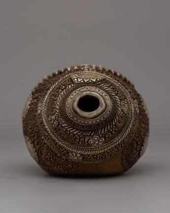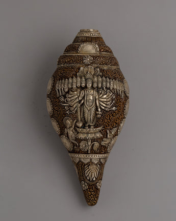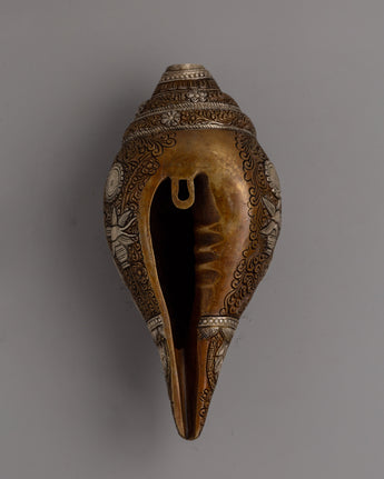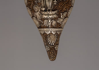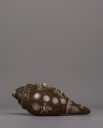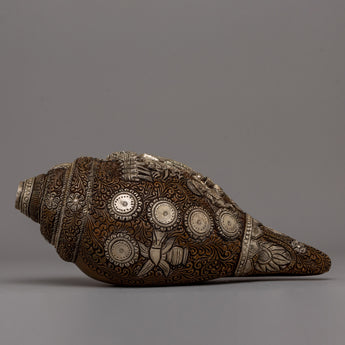 Enhance your spiritual rituals with this Handmade Religion Pooja Sankha, which is made of oxidized copper and delicately electroplated in silver. This conch shell, 11.5cm tall and 25cm wide, is a stunning example of traditional workmanship. Its surface has elaborate carvings and ornate embellishments that reflect Tibetan artistry's rich cultural and spiritual legacy.
