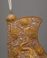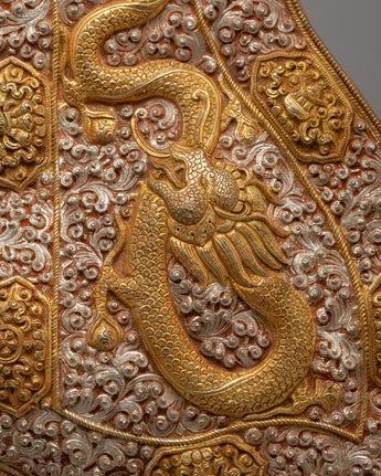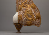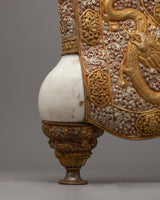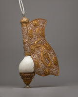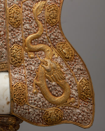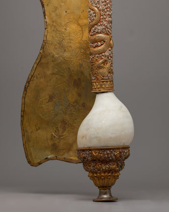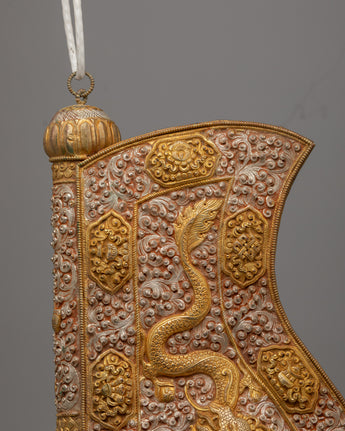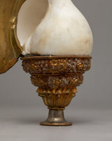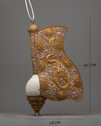 The Puja Sankha will elevate your sacred rituals. It is beautifully constructed on a copper body with a sacred conch shell, and it has a stunning gold and copper plating with a detailed dragon carving on it. This celestial representation of purity and enlightenment is 46 cm tall and 28 cm wide, and it weighs 2.47 kg.