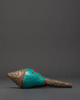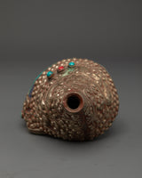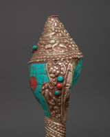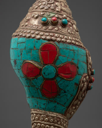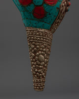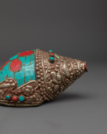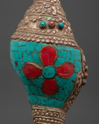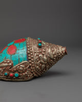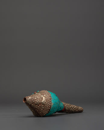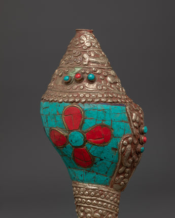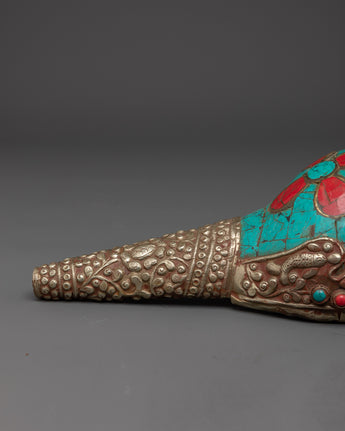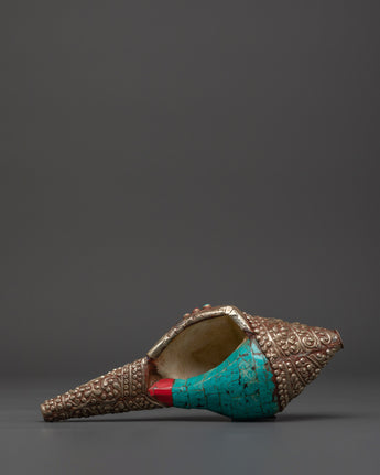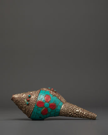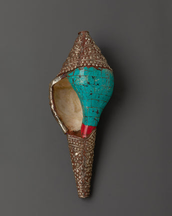 This handcrafted Ritual Conch, or Shankha, holds deep significance in Tibetan and Hindu ceremonies as a symbol of purity, auspiciousness, and the resonant voice of the Dharma. Expertly adorned with embedded coral and turquoise, it incorporates powerful symbols of vitality, healing, and protection, enhancing its spiritual potency. Traditionally blown during puja rituals, this sacred conch also serves as a meaningful element in Vastu-aligned spaces, promoting harmonious energy flow. Its presence as a centerpiece in Buddhist shrines or sacred altars elevates the spiritual atmosphere, making it an essential tool for practitioners seeking to deepen their ceremonial practice and connection to divine energies.