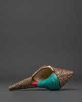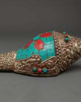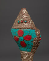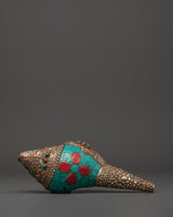 Invoke sacred sound and divine energy with this beautifully handcrafted Tibetan Ritual Conch Shell, featuring copper work and inlaid with artificial coral and turquoise stones. Measuring 27.5 cm in width and weighing 0.69 kg, this Shankha is not only a powerful ritual tool but also a striking piece of spiritual art for your temple or altar.