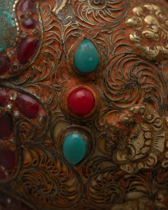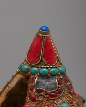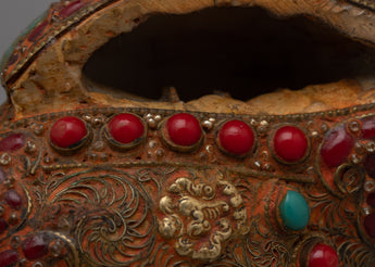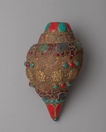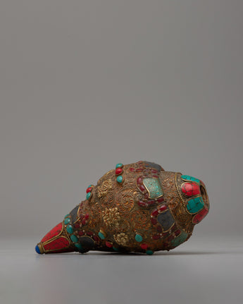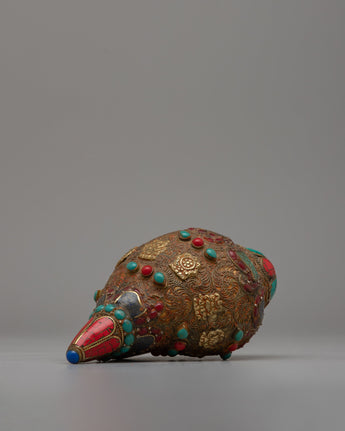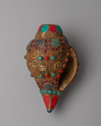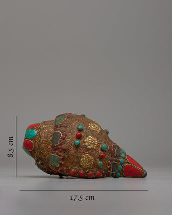 The Shankh, crafted with great attention to detail, is highly valued in Hindu and Buddhist traditions for its sacred resonance and purifying vibrations. The incorporation of gemstones heightens its spiritual potency, with each stone picked for its distinct characteristics and symbolic importance.