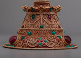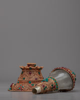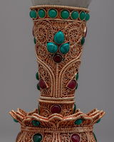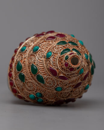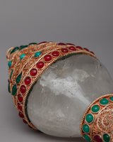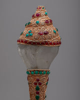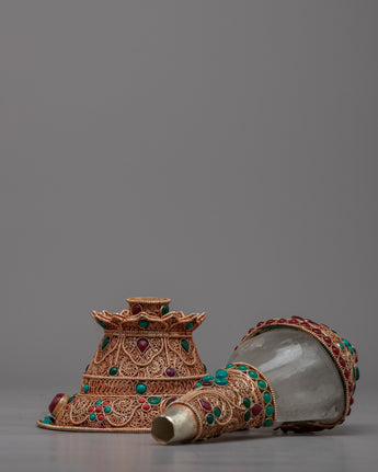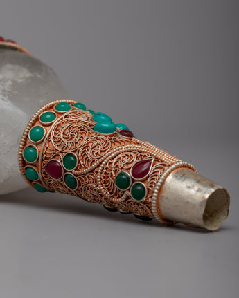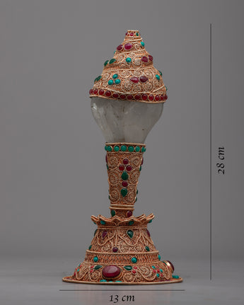 Behold the exquisite Silver Sankha Shankha, a masterpiece of craftsmanship handcrafted on a copper body and adorned with a lustrous silver plating. The elegant design of this sacred conch shell features intricate engravings that evoke a sense of reverence and spirituality. As an auspicious symbol in various religious ceremonies, this Sankha Shankha holds deep cultural significance and is revered for its purifying properties. The addition of sparkling crystal stones further enhances its beauty and imbues it with a divine aura. Embrace the sanctity of this Silver Sankha Shankha in your religious practices and experience the profound connection it brings to the spiritual realm.