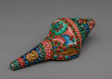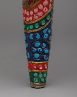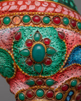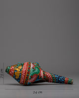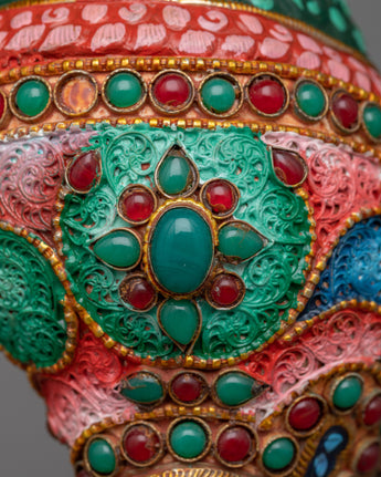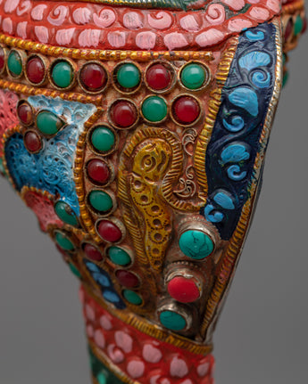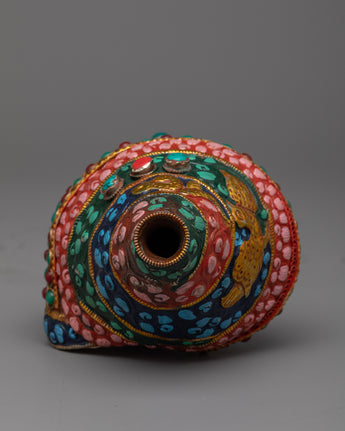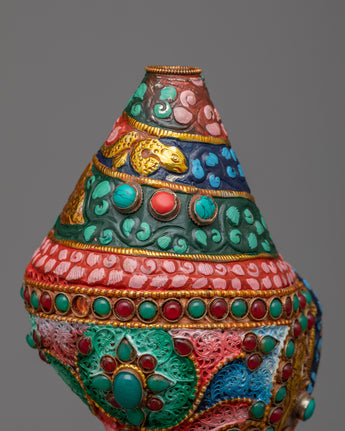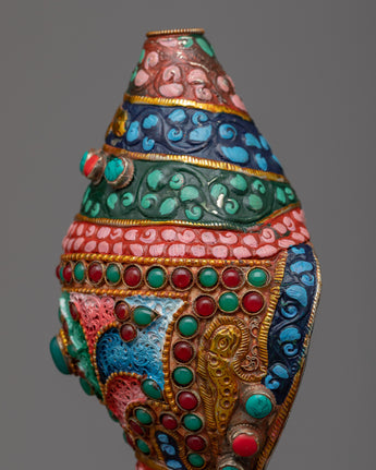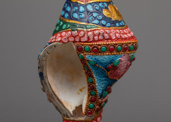 The Small Conch Shell is meticulously handcrafted on a copper body, showcasing the artisan's skill and attention to detail. The conch shell is a sacred symbol in Buddhism, representing the divine sound of the teachings and the call to awaken. To enhance its beauty, gemstones are embedded in the shell, adding a touch of elegance and sparkle. Additionally, color painting is done on the shell, further enhancing its visual appeal and making it a stunning decorative piece. The combination of handcraftsmanship, embedded gemstones, and color painting makes this small conch shell a unique and meaningful addition to any spiritual collection or altar.