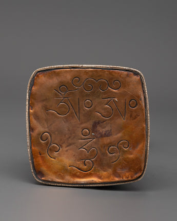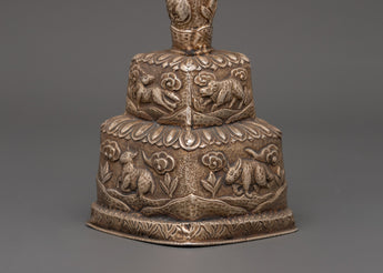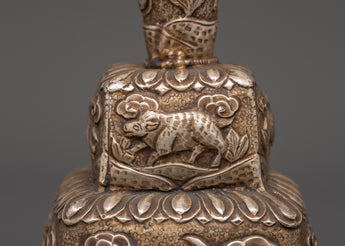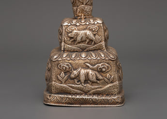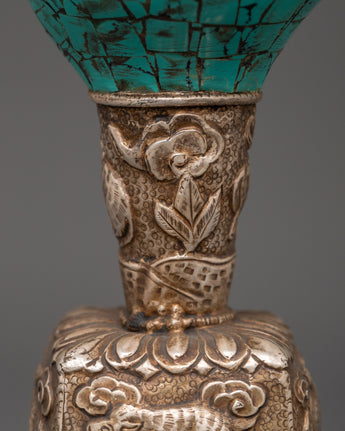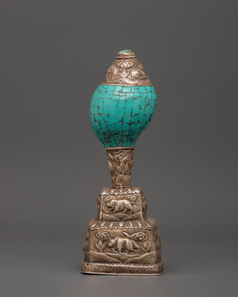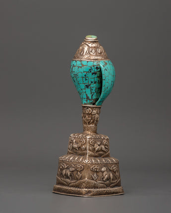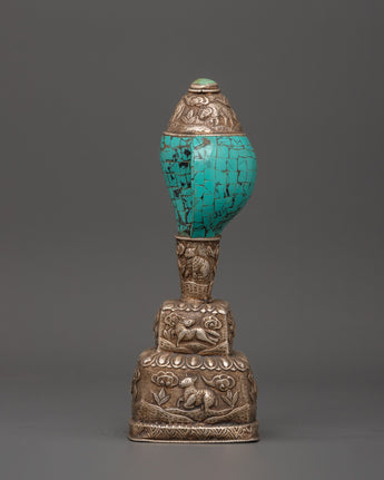 Pure silver Sound and Spirituality Conch is embellished with turquoise stones and pure silver carvings at the top and bottom of the conch. The Sankha sits atop a wonderfully carved base with elaborate flower and animal designs. Furthermore, a phrase is engraved beneath the base. This sacred conch, standing 20cm tall and weighing 0.64kg, is widely utilized in Tibetan Buddhist rituals, pujas, and sound healing practices.
