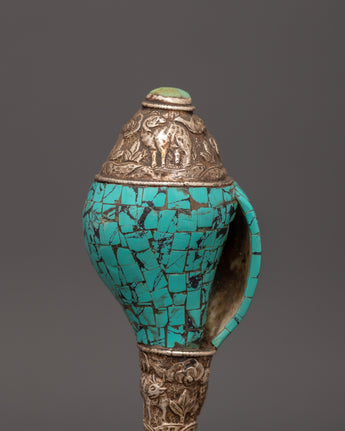 This pure silver conch shell has intricate workmanship and inset turquoise stones representing spiritual anchoring and healing. Each piece is crafted with care by talented Himalayan artisans, ensuring authenticity and cultural accuracy. Whether put on a shrine, used in meditation, or given as a sacred object, this ritual conch promotes harmony, clarity, and deep spiritual connection.