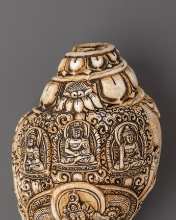 Crafted from conch Shell, this artwork reflects the skill and spiritual essence of Tibetan artisans. Featuring carvings of the Dhyani Buddhas, representing the five wisdoms, alongside Tara, the goddess of compassion, it stands as a meaningful symbol of inner calm, healing, and insight. Beyond its sacred beauty, this piece brings spiritual value, fostering a peaceful atmosphere ideal for meditation or ritual use.