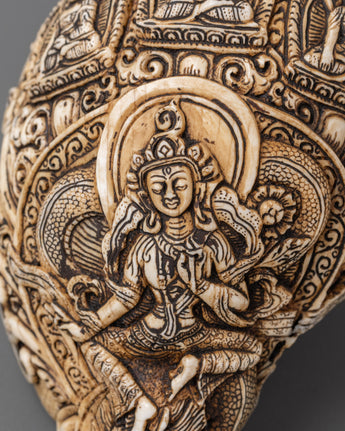 Three Dhyani Buddha and White Tara Carved Conch | Conch Shell