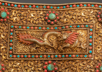 The ritual conch horn showcases exquisite Tibetan craftsmanship through its intricate decorative elements and symbolic motifs. The gold-plated copper fittings feature elaborate scrollwork, lotus patterns, and traditional Buddhist symbols that frame the pristine white conch shell. Vibrant coral and turquoise stone inlays create stunning visual contrast while carrying deep spiritual meaning. Turquoise represents healing and protection, while coral symbolizes life force energy. The dragon motifs carved into the metalwork represent wisdom and power, while flowing cloud patterns symbolize the transcendent nature of Buddhist teachings. This monastery prayer instrument transforms the natural beauty of the conch into a vessel of divine communication.