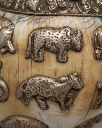 The 97.5% silver Tibetan Conch Sankha is a remarkable work of spirituality and elegance. This sacred thing weighs 0.67 kg and is 22 cm wide by 10 cm tall, with elaborate silverwork embellishing it. It is made from an actual conch shell. It is a significant ritual tool or a remarkable decor piece since it has intricate silver engravings representing symbolic themes that encapsulate Tibetan Buddhist traditions.