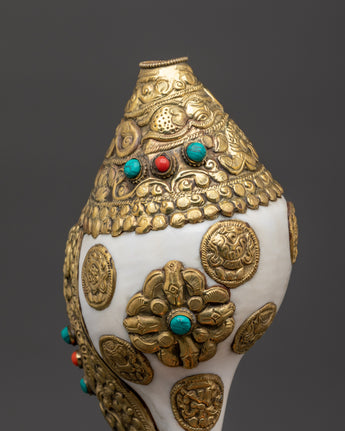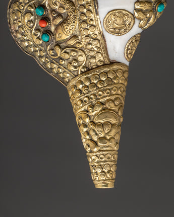 In Buddhist practice, the conch shell is a sacred ceremonial instrument representing the spreading Dharma across the universe. It is one of the Eight Auspicious Symbols (Ashtamangala) and is commonly blown during prayer rituals, festivities, or processions to purify the environment and bring benefits. The shining brass overlay symbolizes protection and spiritual strength, while the coral and turquoise stones represent compassion, healing, and divine insight.