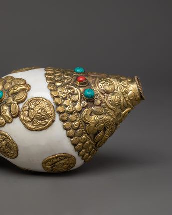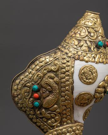 This Tibetan Ritual Conch Shell (Shankha) has a wonderfully carved brass inlay over a conch shell adorned with artificial turquoise and coral stones. This ceremonial piece is 13 cm tall, 28.5 cm wide, and weighs 0.91 kg. It is rich in spiritual significance and artistic depth. The intricate artwork incorporates auspicious themes, flower mandalas, and the Dharma symbol, making it both a spiritual instrument and a decorative ritual item.