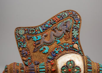 This Shankha is created from a copper body that has been electro-plated and decorated with stunning filigree work. Carefully inlaid genuine lapis lazuli, turquoise, and coral stones give warm colors and improve the piece's appearance. This sculpture is a magnificent example of traditional skill, with each aspect showcasing the talent and commitment of Nepalese artisans.
