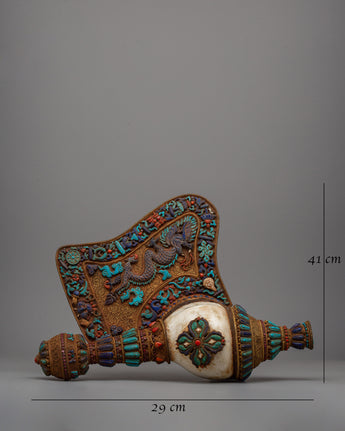 At 41 cm tall and 29 cm broad, the Tibetan Ritual Conch Shell (Shankha) is a powerful and attractive addition to any religious environment. Its fan-shaped form, embellished with elaborate patterns and sacred symbols, combines ceremonial significance with aesthetic elegance. A traditional instrument in spiritual rituals, the Shankha typically employs sound to represent the divine connection.
