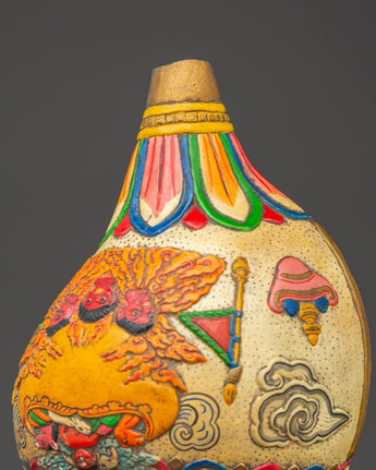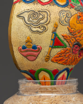 The Shankha, or conch shell, is a highly revered ceremonial instrument in Tibetan Buddhism, symbolizing the emergence of spiritual consciousness and the sacred sound of the Dharma. This hand-painted Shankha, traditionally used in pujas and ceremonies, blends traditional symbolism with contemporary artistic skill to create a potent ritual object and a striking decorative piece.