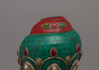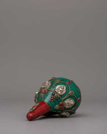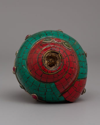 Tibetan Sacred Sankha | Handmade Copper Ritual Conch with Decorative Stones