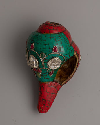 This magnificent Tibetan Sankha is a stunning combination of spiritual symbolism and handmade craftsmanship. This holy conch shell has a copper body and is electro-silver-plated for a polished appearance. It is embellished with fake coral and turquoise stones. These vivid highlights add to its visual appeal and represent peace and protection in Tibetan traditions. With a height of 9.5cm and a width of 17cm, this Sankha is a nicely proportioned ritual relic weighing 0.82kg that serves as both a valuable and ornamental addition to your sacred space or altar.