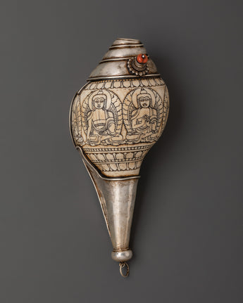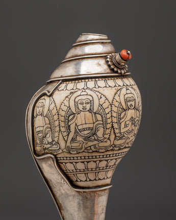 Tibetan Silver Conch Shell With Buddha Carvings and Coral Inlay