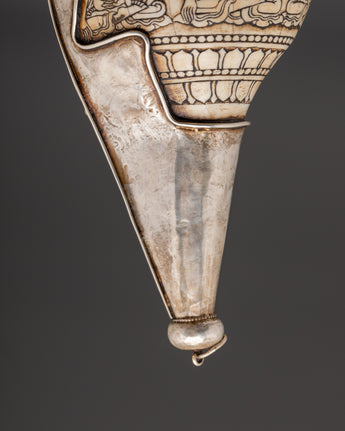 This Tibetan Silver Conch Shell is an adored symbol of the Dharma, hand-engraved with seated Buddha figures and intricately set within complex silverwork. The conch shell (shankha) is revered in the Himalayan Buddhist tradition as representing the sound of truth flowing throughout the universe. This piece, adorned with intricate lotus patterns and accented with coral inlay, embodies a fusion of spiritual power and artisanal craftsmanship.