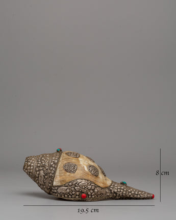 This handcrafted Tibetan silver conch shell, also known as a sacred conch shell or Sankha is a classic representation of tradition and spirituality. This exquisite item, which measures 19.5 cm in width and 8 cm in height, has been decorated with meticulous inlays of stunning coral and turquoise stones and elaborate 97.5% silverwork. This piece is attractive and meaningful because it combines the natural conch shell and the skillfully made silver patterns that showcase the skills of talented Tibetan artists.