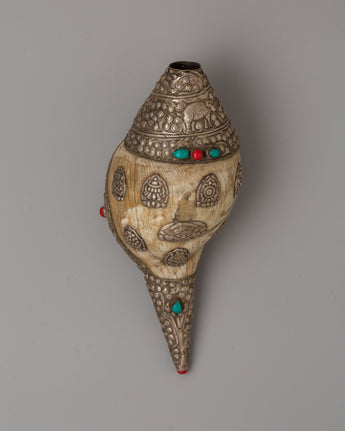 In Tibetan Buddhism, the conch shell is highly valued for its spiritual meaning. It is commonly used in ceremonies and rituals to represent purity, awakening, and the dissemination of good energy. The colorful coral and turquoise inlays further enhance the spiritual importance, which is thought to foster peace and protection.