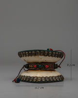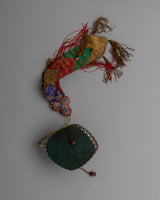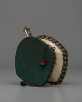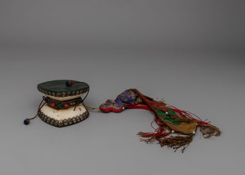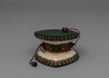 A Chod drum, integral to the Chod spiritual practice in Tibetan Buddhism, is a unique and symbolic instrument. Also known as a damaru, this small, double-sided hand drum has a narrow waist connecting two drumheads. The drum's shape is often likened to the hourglass, embodying the union of wisdom and compassion. Used by Chod practitioners during ritualistic ceremonies, the drum's rhythmic beating is believed to connect with the sacred energies, facilitating meditation and the realization of emptiness. The Chod drum, with its ritualistic role, underscores the synthesis of sound, spirituality, and meditation in Tibetan Buddhist traditions.