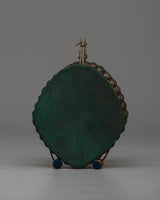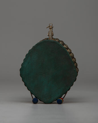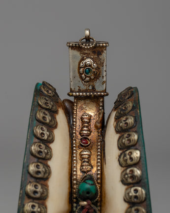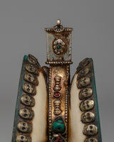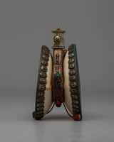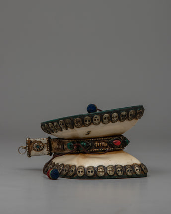 Enhance your spiritual practice with this handcrafted Tibetan Skull Damaru Drum, which is a wonderful representation of Himalayan work and spiritual tradition. This religious instrument has an exquisite design with a resin body, white metal skull head decorations, and Original Stone turquoise and coral stones. This damaru, which is 8.3 cm in height and 11.7 cm in width and weighs 0.288 kg, is lightweight and compact, making it ideal for ceremonial use, meditation, or as an eye-catching altar piece.