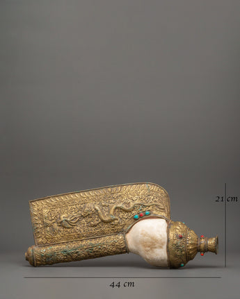 This traditional Tibetan conch shell represents purity, knowledge, and the spread of Dharma (Buddhist teachings). The conch (Shankha), which is used in Buddhist rites, temple ceremonies, and meditation practices, is thought to evoke divine benefits, repel negativity, and boost spiritual vitality. This magnificent conch, measuring 21cm in height and 44cm in breadth, is a vital altar item and meditation tool for practitioners and collectors.