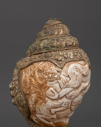 This conch shell measures 10.5 cm in height, 21 cm in width, and weighs 0.68 kg. It has a natural shell body adorned with floral repoussé-style copperwork and is beautifully inlaid with artificial coral and turquoise stones. The image carved on the shell depicts a fierce deity riding a mythical beast, representing protection and spiritual power. Each detail demonstrates Tibetan traditions and artistic skill.