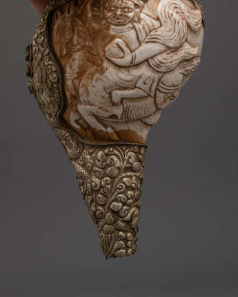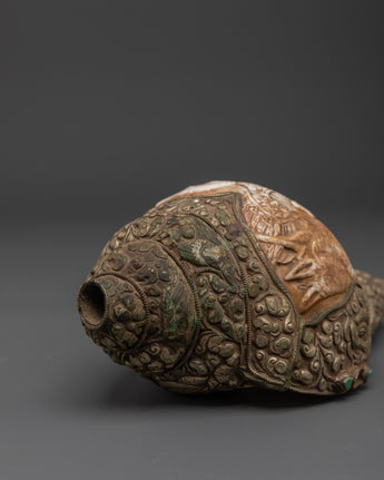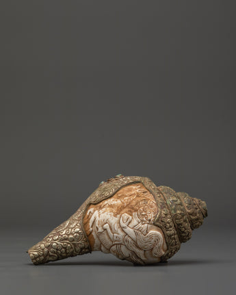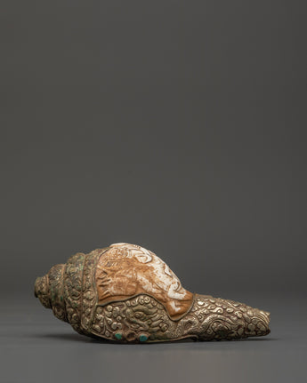 This Traditional Ritual Conch Shell is a sacred Tibetan Buddhist artifact, handcrafted with intricate copper accents and symbolic deity engravings. In Himalayan spiritual ceremonies, the conch shell (or Dung Dkar) represents the sound of awakening and the spread of the Dharma in all directions. It is blown during pujas and placed on altars to bring blessings and cleanse the ritual space.