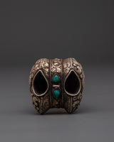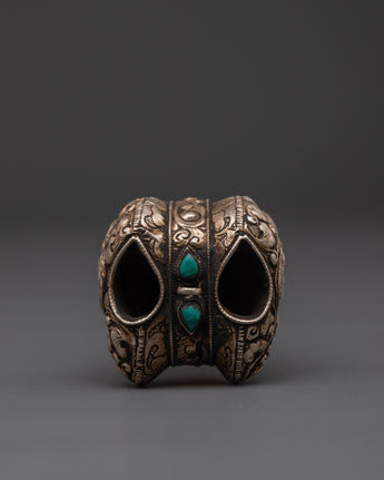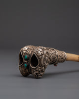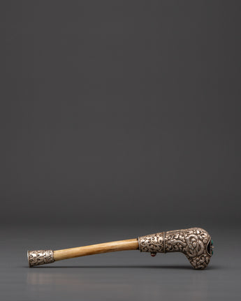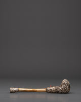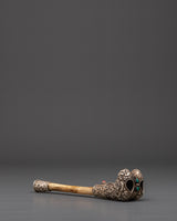 The Traditional Tibetan Kangling is a magnificent ceremonial instrument with deep roots in Tibetan Buddhist traditions. This precious object is decorated with beautiful patterns that represent spiritual awakening and transformation. The handle has gorgeous designs and sacred carvings that represent Tibetan Buddhist teachings. The large aperture at the top, which resembles a skull, serves as a striking reminder of mortality and the interdependence of life and death. The Kangling is used in spiritual rituals to encourage practitioners to interact with the cycle of life, death, and rebirth, enhancing their meditation and ritual practices.