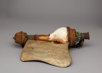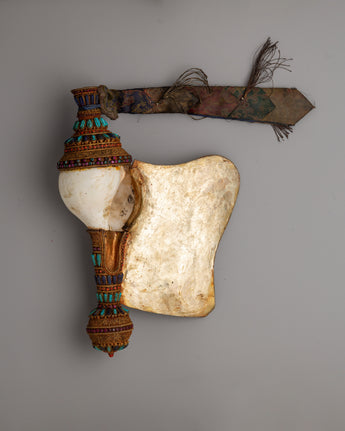 In Buddhist and Hindu traditions, this handcrafted Traditional Tibetan Shankha for Meditation is a highly valuable ritual item. As a reminder of the powerful connection between sound and the divine, it is adorned with elaborate sacred trends and symbolic designs. The conch's resonant sound is frequently used to purify areas or to signal the start of spiritual activities. It is a beautiful decorative piece and a useful ceremonial tool due to its shiny exterior and intricate carvings.