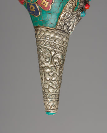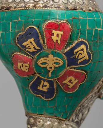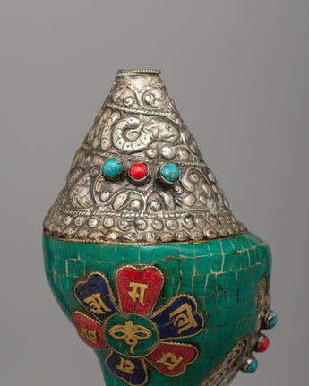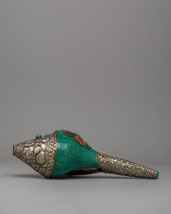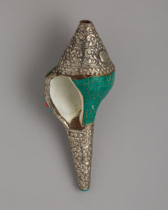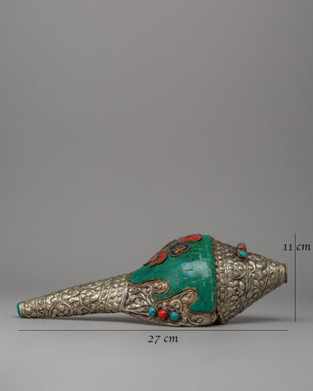 This Turquoise Conch Shell (Sankha) stands at 11 cm in height and 27 cm in width, weighing 0.668 kg. It is a finely crafted piece with silver plating that enhances its aesthetic appeal. The floral carvings on the shell are intricate, showcasing the detailed and delicate nature of traditional Tibetan artistry. These carvings not only elevate the visual appeal of the conch but also contribute to its spiritual significance. The turquoise and coral stones are strategically placed, adding color and energy to the conch, making it more than just an ornamental item.