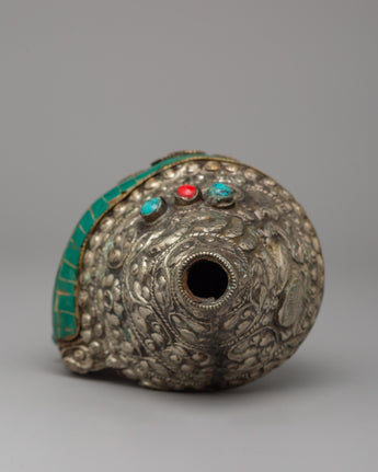In addition to its visual beauty, this conch holds spiritual importance in Buddhist rituals. The turquoise is considered a protective stone, while coral is believed to carry healing properties, offering symbolic strength and vitality. The floral carvings enhance the connection to the natural world, while the overall shape and design of the conch make it a valuable tool for ritual offerings and blessing ceremonies. This unique conch is a powerful combination of aesthetic beauty, spiritual symbolism, and practical use, serving as both a sacred artifact and a decorative item for Tibetan spiritual practices.