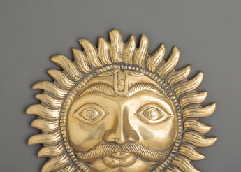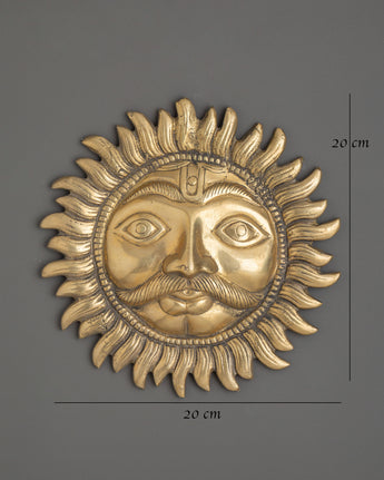 This magnificent Brass Sun Wall Hanging is 20cm in height and breadth and weighs 1.05kg, making it a bold and significant addition to any wall area. Made of brass, the sculpture depicts a wonderfully crafted sun face with expressive eyes and a dazzling glow, representing strength, clarity, and spiritual rebirth.
