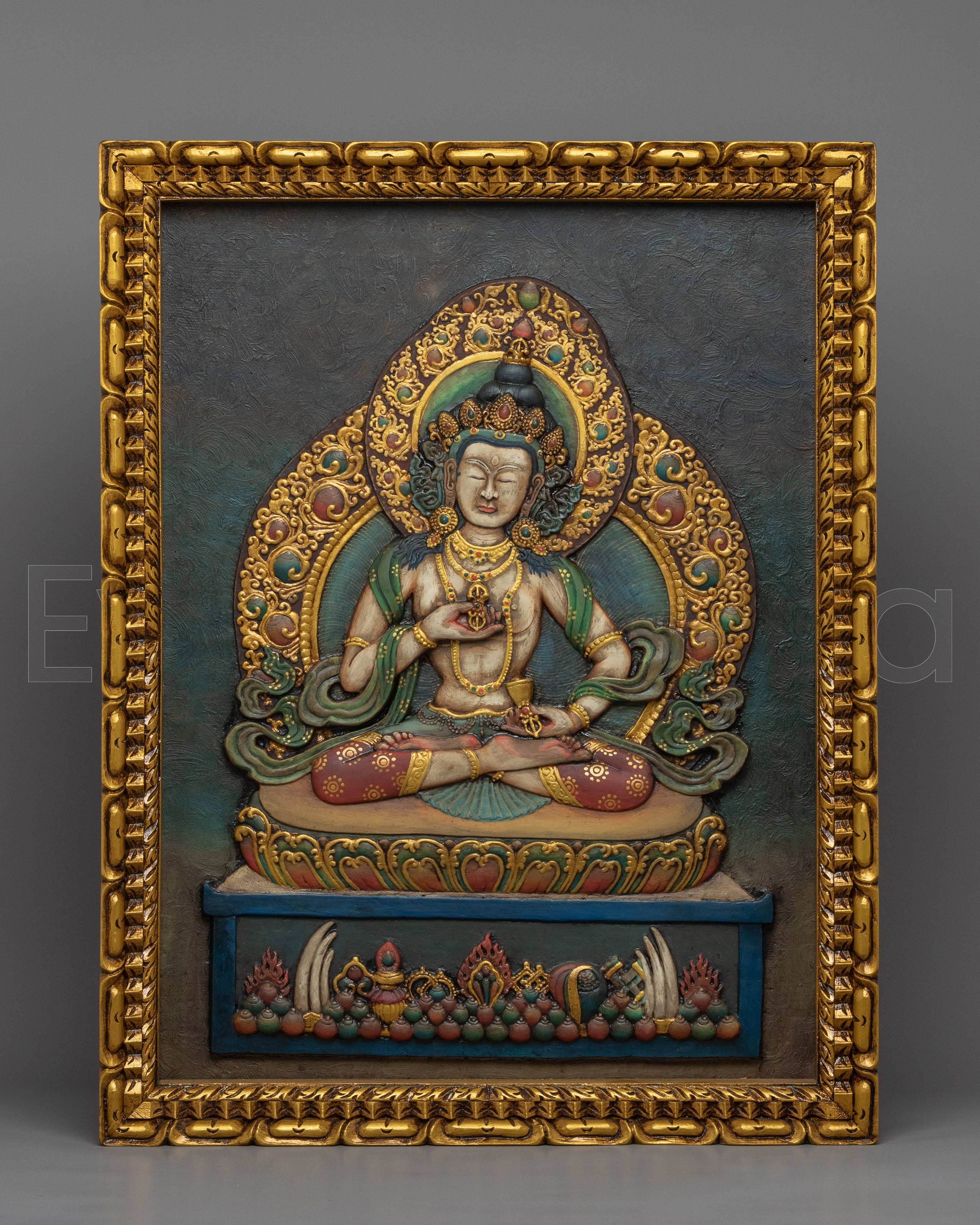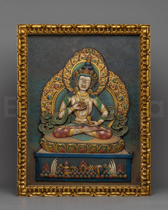 Vajrasattva is depicted in relief art with a fiber border and a wooden ply background. The deity is intricately sculpted with clay, showcasing fine details of the deity's form and expression. The relief art is a stunning piece of artwork that captures the essence of Vajrasattva's divinity and spiritual energy.