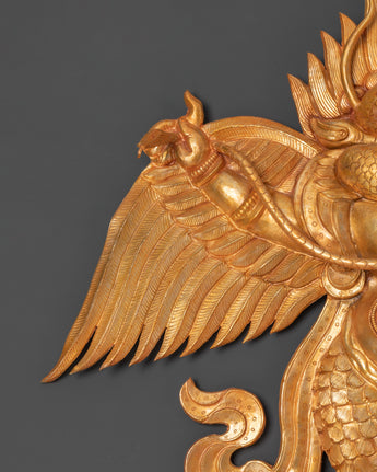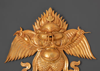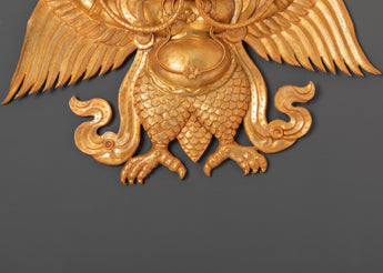 This gold-plated Garuda wall hanging exemplifies traditional Tibetan artwork, with detailed design on the wings, scales, and facial features. Each feature is meticulously hand-carved and polished to reflect the deity's strong yet loving personality. The bright gold finish represents purity, wisdom, and enlightenment, while the copper foundation provides durability and strength. This Garuda is more than just a decorative sculpture; it serves as a spiritual protector, reminding practitioners of strength, victory over inner difficulties, and wisdom over ignorance.