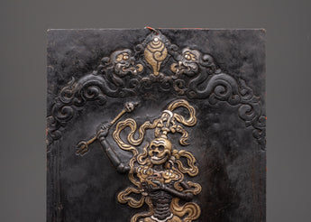 This stunning Buddhist wrathful protector wall hanging reflects the deep cultural and spiritual heritage of the Himalayas. Crafted from iron with intricate silver and brass inlays, this 32cm high, 23.5cm wide, 0.68kg plaque presents a fierce dharma protector deity, created to ward off negative energies from sacred spaces. The masterful repoussé metalwork adds dimensional relief, bringing the deity’s fierce energy to life with remarkable detail.
