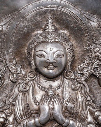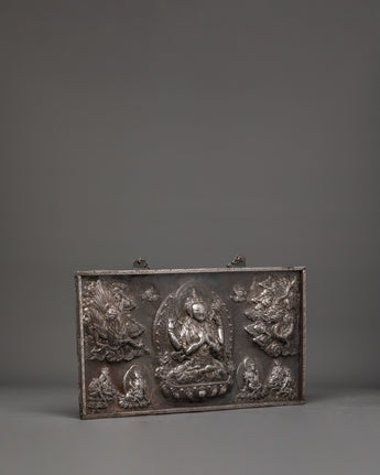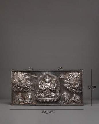 This exquisite Chenrezig Deity Wall Hanging is a religious piece that depicts the compassionate presence of Avalokiteshvara, also known as Chenrezig. The wall hanging is made of iron and has a rustic chemical treatment, giving it a timeless vintage aspect. This magnificent piece of Tibetan Buddhist art, measuring 33cm tall and 62.5cm wide and weighing 3.61kg, is excellent for altars, meditation rooms, or as the focal point of spiritual home decor. Chenrezig, the embodiment of infinite compassion, sits gracefully in the center, radiating peace and serenity.