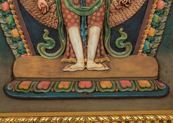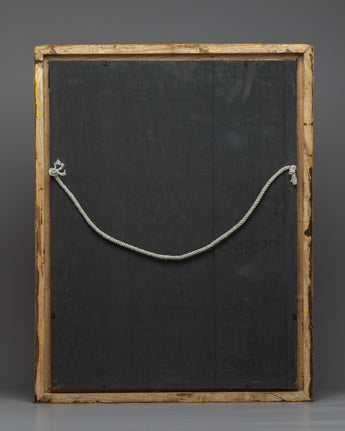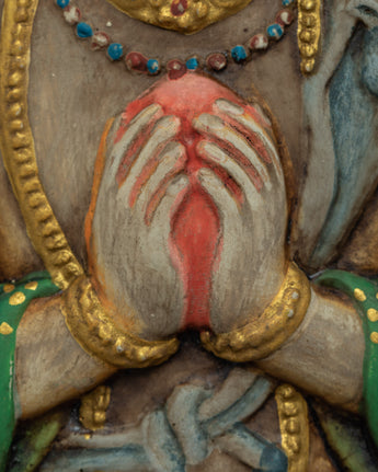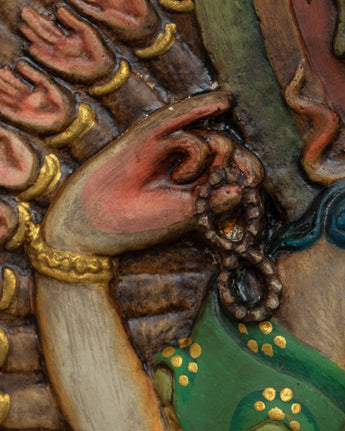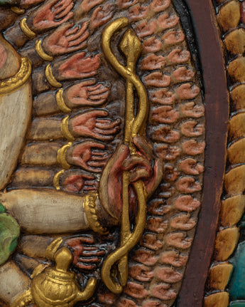 The wooden thangka art of the Bodhisattva is dedicated to the formidable 1000 Armed Chenrezig Mantra practice. Adorned with shining jewels and patterned silk, Avalokiteshvara holds a lotus, bow, arrow, and Empowerment vase in his left hand and a crystal rosary, Dharmachakra, and offering mudra in his right hand. The first two hands are clasped with a wish-fulfilling stone resting upon his heart. The deity boasts eleven heads, each representing a calm, semi-wrathful, or wrathful trait.