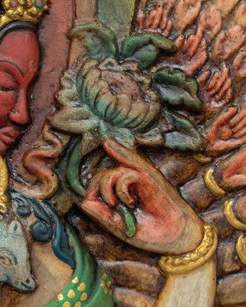 This stunning wooden thangka of 1000 armed Chenrezig will empower you during meditation or yoga and on can be utilized for many Buddhist ceremonies and rituals.