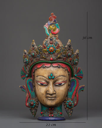 Enhance your spiritual place with this gorgeous Colorful Deity Wall Hanging Mask, a handcrafted masterwork measuring 36cm in height and 22cm in width. This Tibetan god mask, crafted from wood and embellished with brilliant acrylic colors, embodies the essence of Himalayan artistry. The complex patterns and vibrant hues infuse life into your meditation or home altar, transforming it into a potent symbol of protection and heavenly energy.