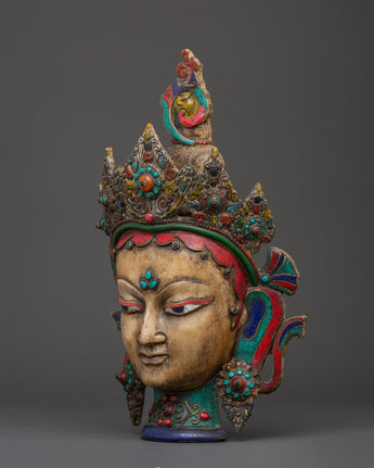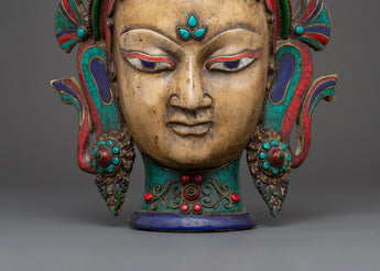 This unique wooden mask is embellished with delicate conch shell accents and meticulously inlaid with artificial stones, including coral, turquoise, and lapis lazuli. It weighs 1.49 kg and carries both visual and spiritual weight, complementing your sacred space with genuine Tibetan craftsmanship. This colorful deity wall hanging mask is ideal for meditation, home décor, or as a collectible, combining ancient symbolism with artistic refinement to represent spiritual balance and cultural heritage.