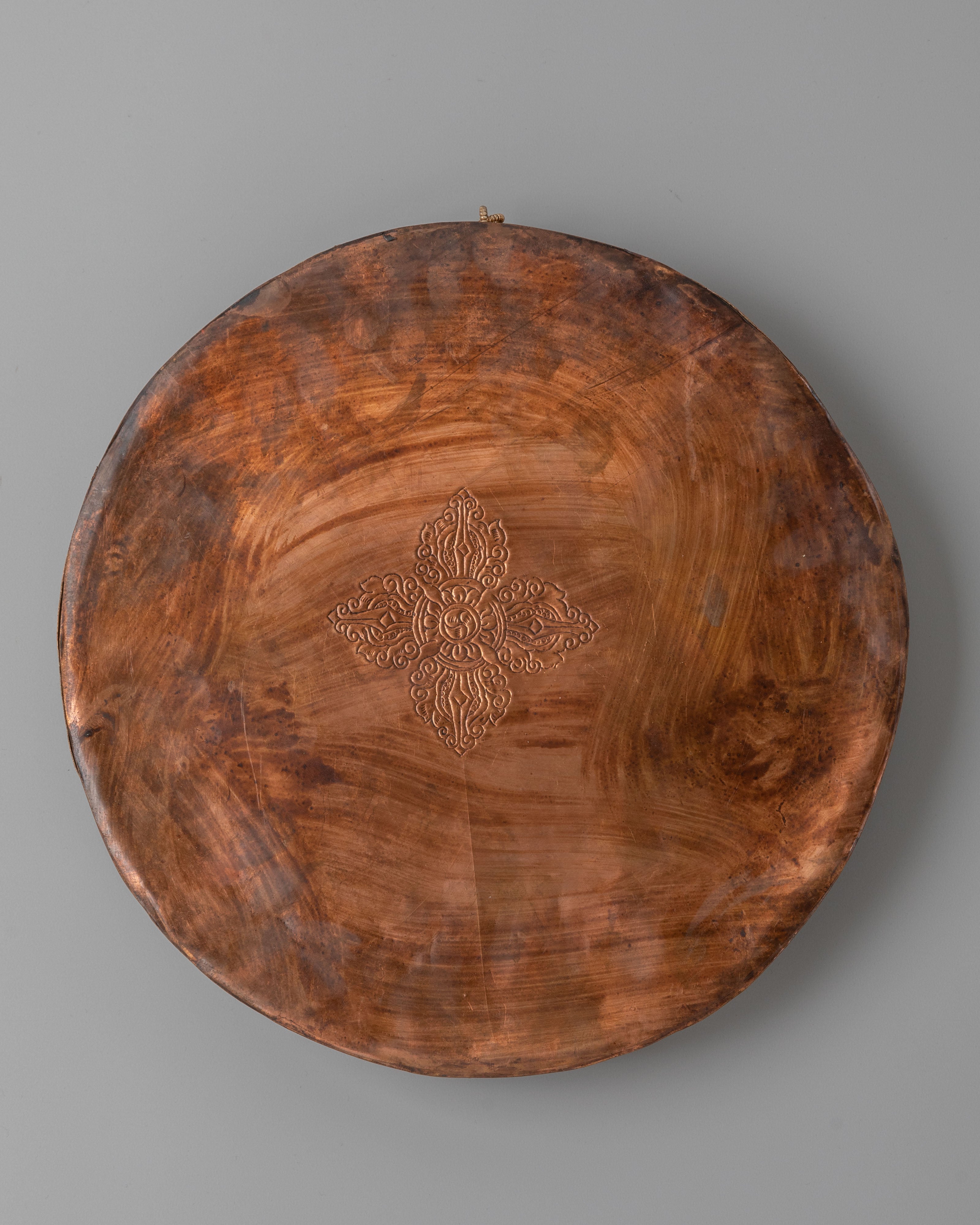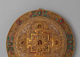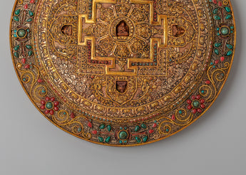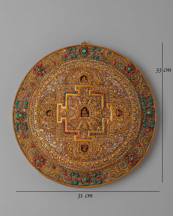 This exquisite wall art, a copper Vairocana mandala, is intended to enhance your holy environment and spiritual practice. This mandala, which weighs 0.99 kg and measures 33 cm in height by 31 cm in width, is made of copper and has a gold coating for a bright, classic appearance. It is both a lovely piece and a significant spiritual tool because of the coral and turquoise stones incorporated into the design, which enhance its spiritual significance and add vivid color.