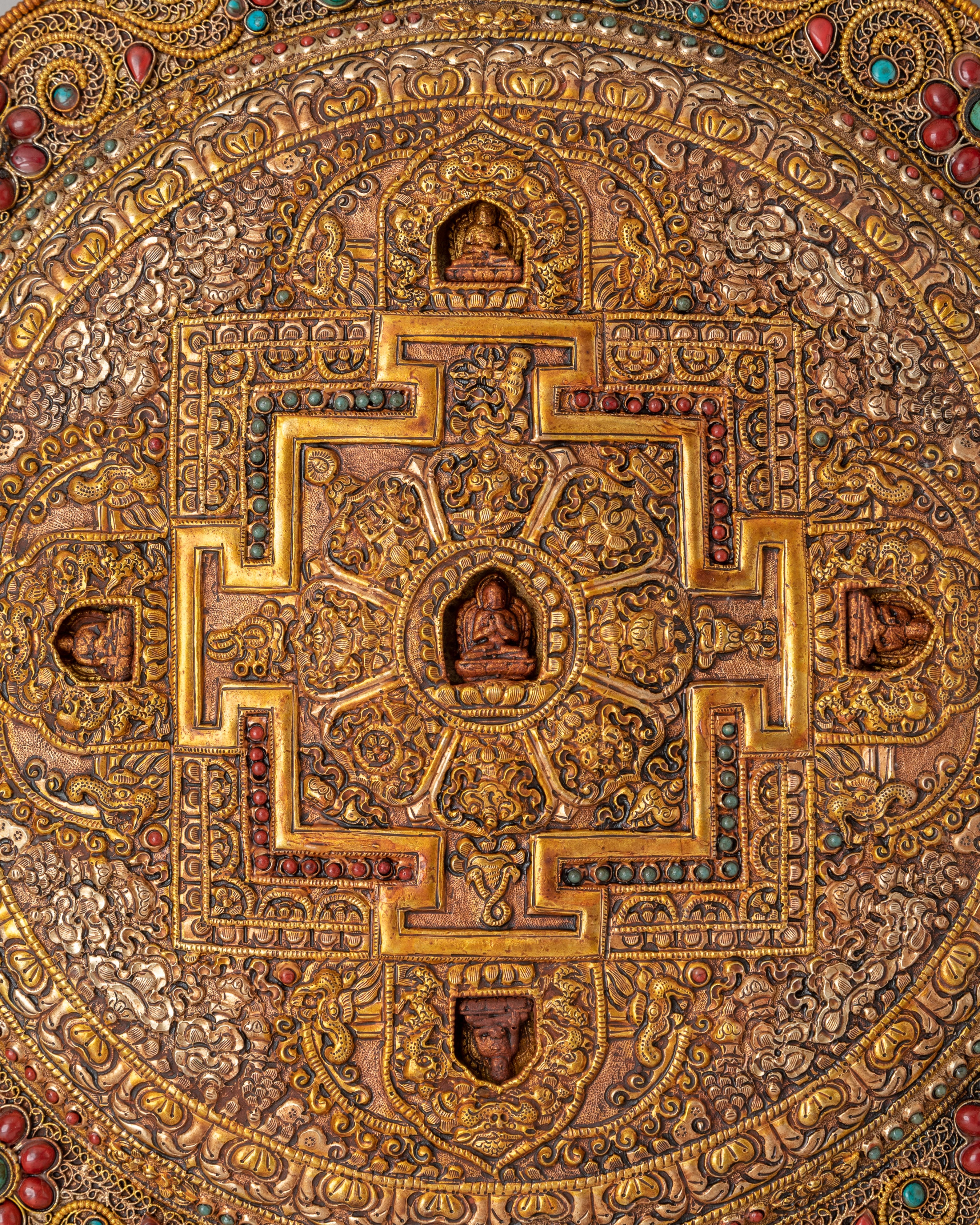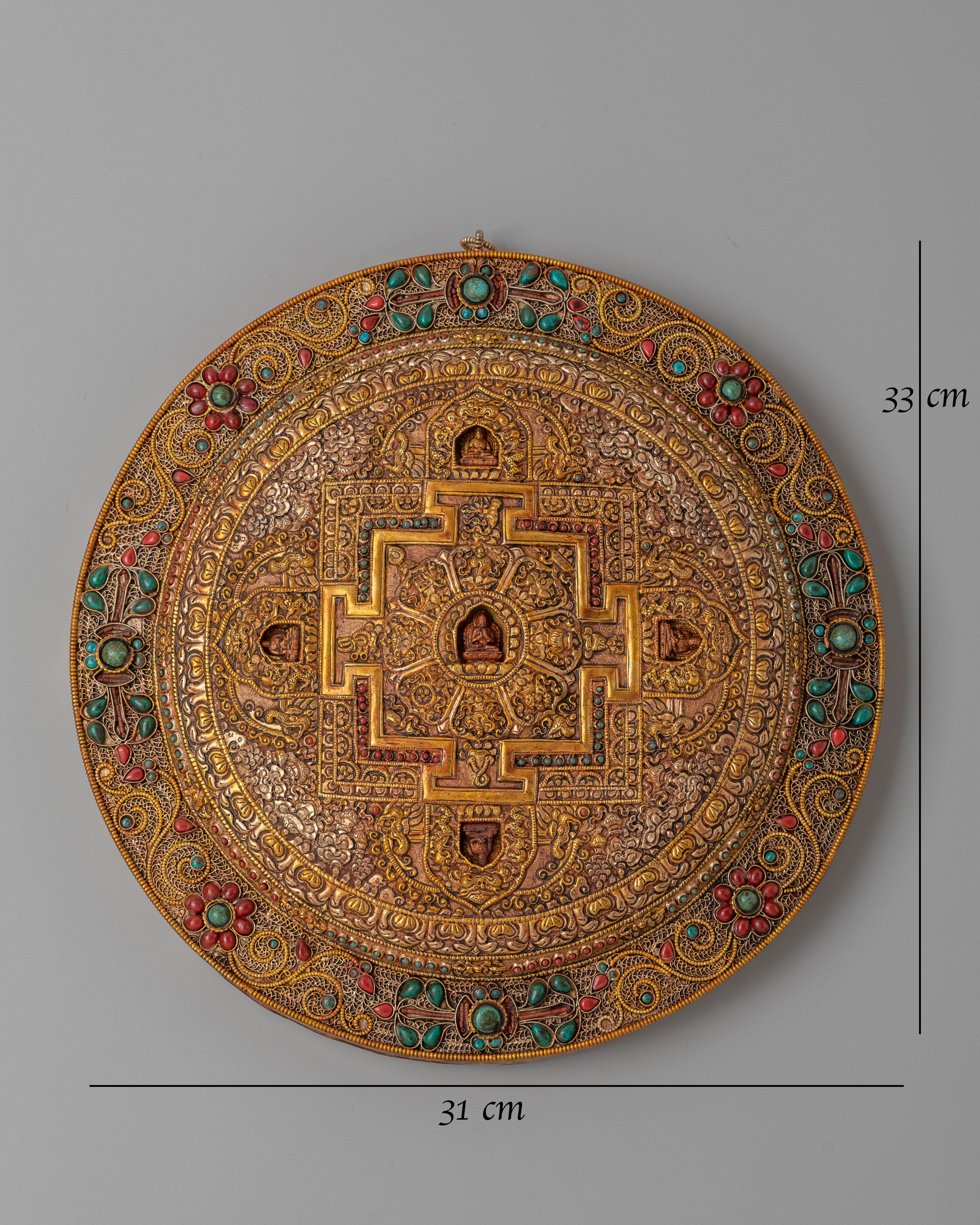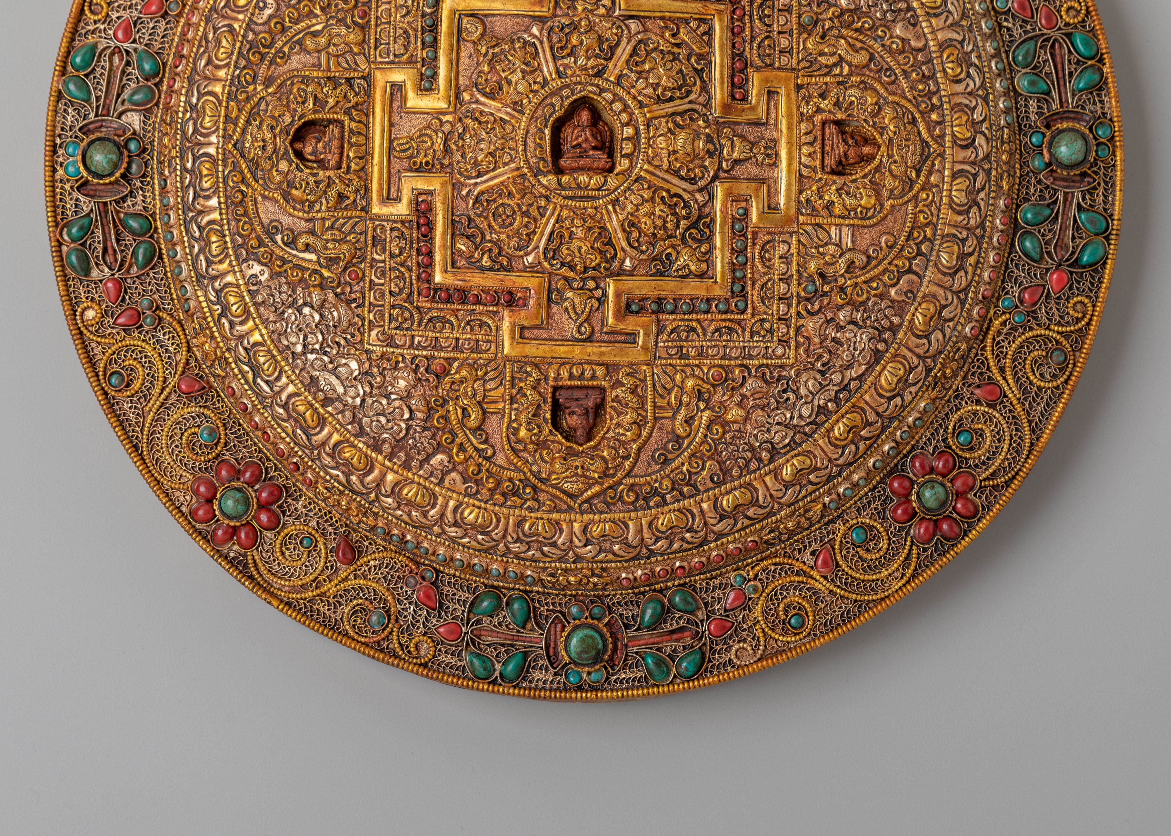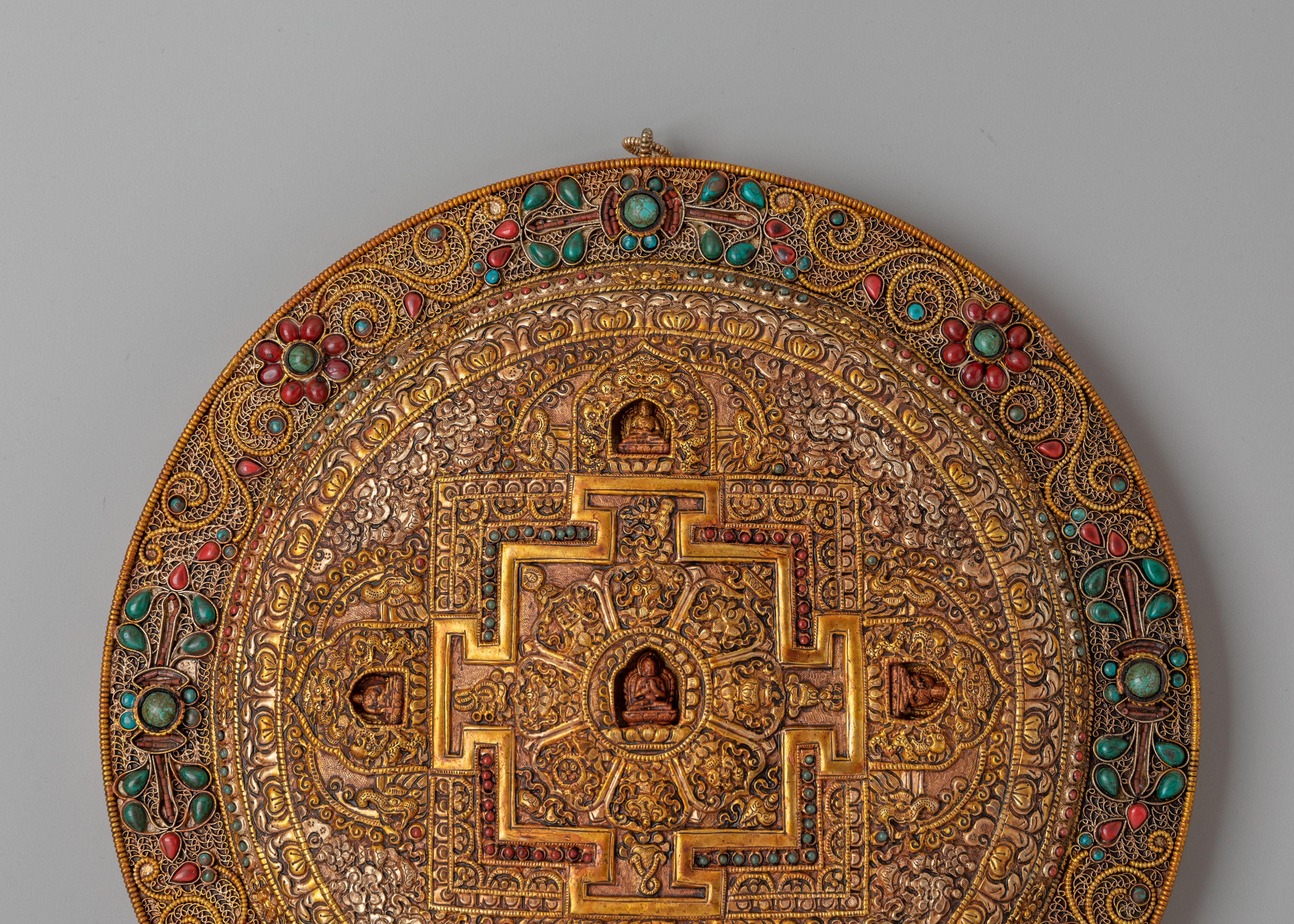The mandala features a detailed geometric design that symbolizes the interconnectedness of the universe and the enlightened path. At the center, Vairocana Buddha is depicted in a meditative posture, surrounded by intricate patterns and motifs that reflect the Buddha's wisdom and universal light. The outer circle is adorned with coral and turquoise stones, which hold symbolic meanings of vitality, protection, and spiritual balance. The gold plating enhances the overall effect, representing the illumination of enlightenment and purity.