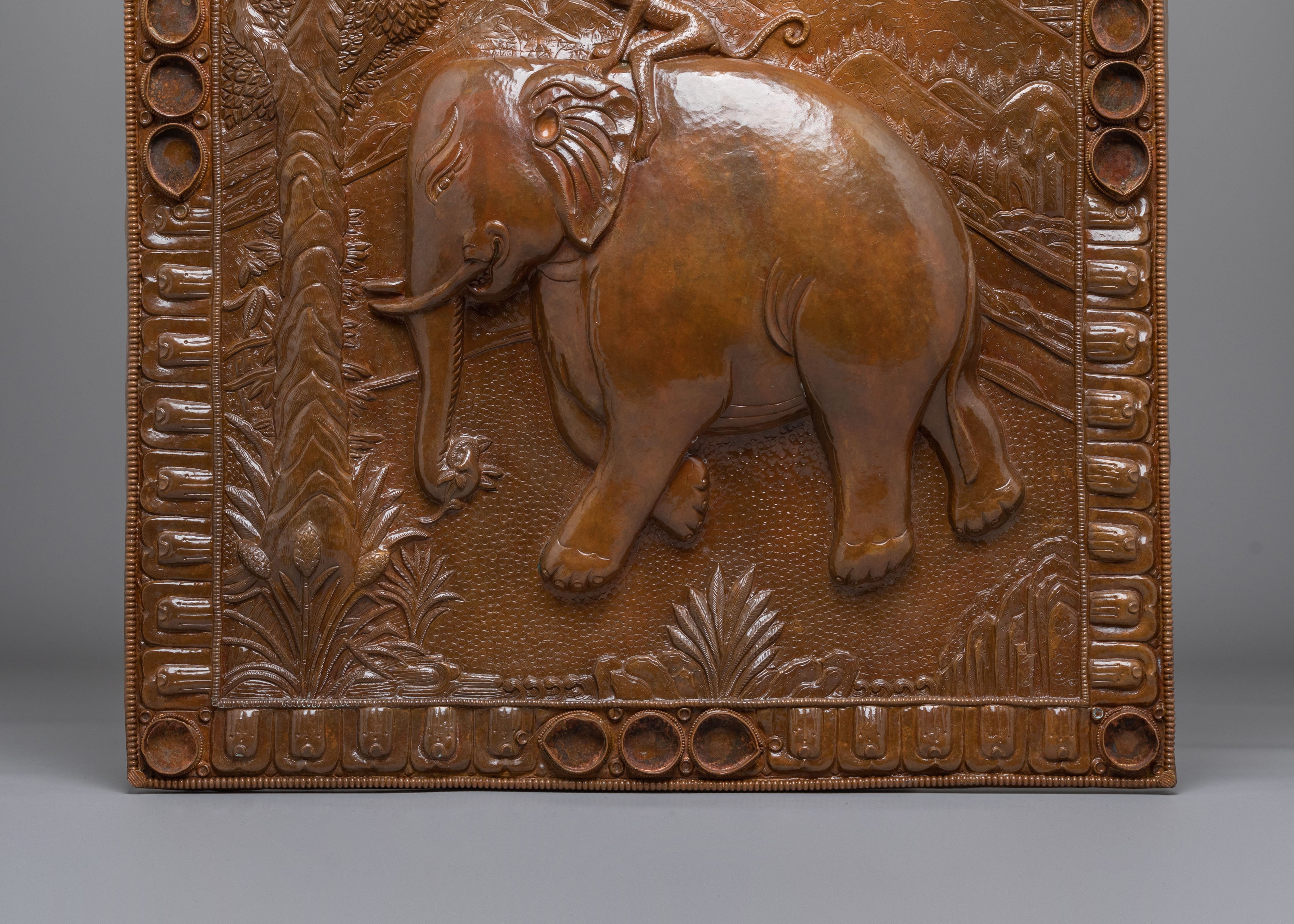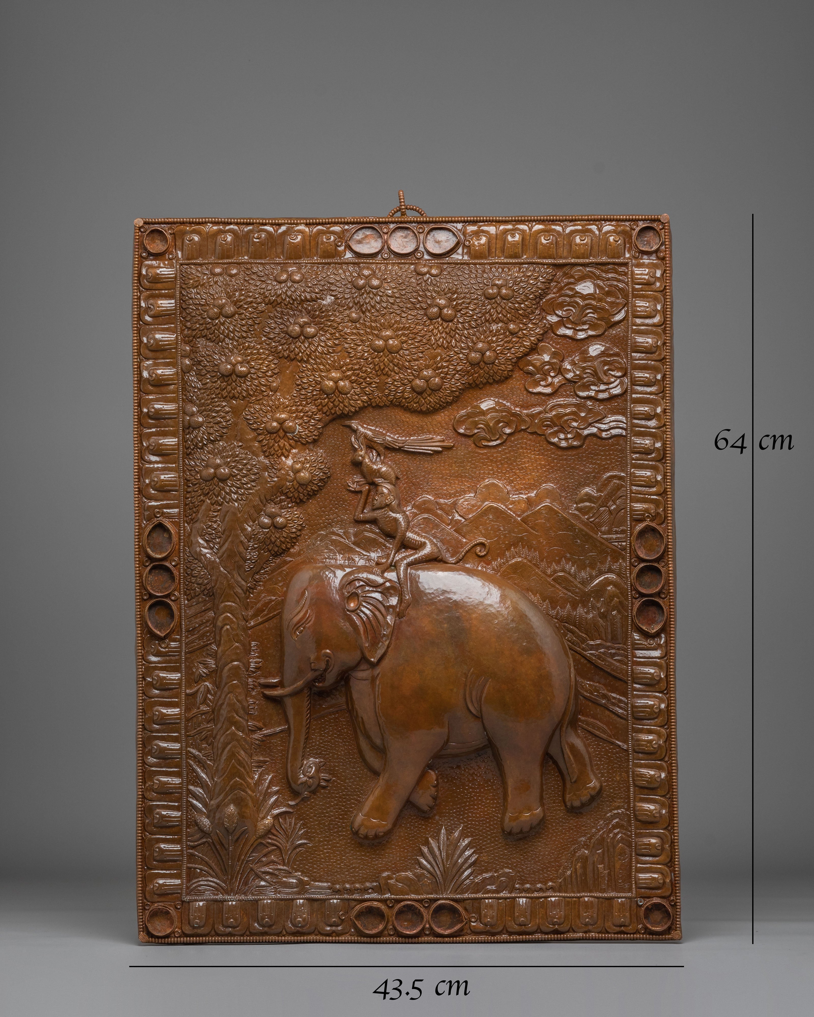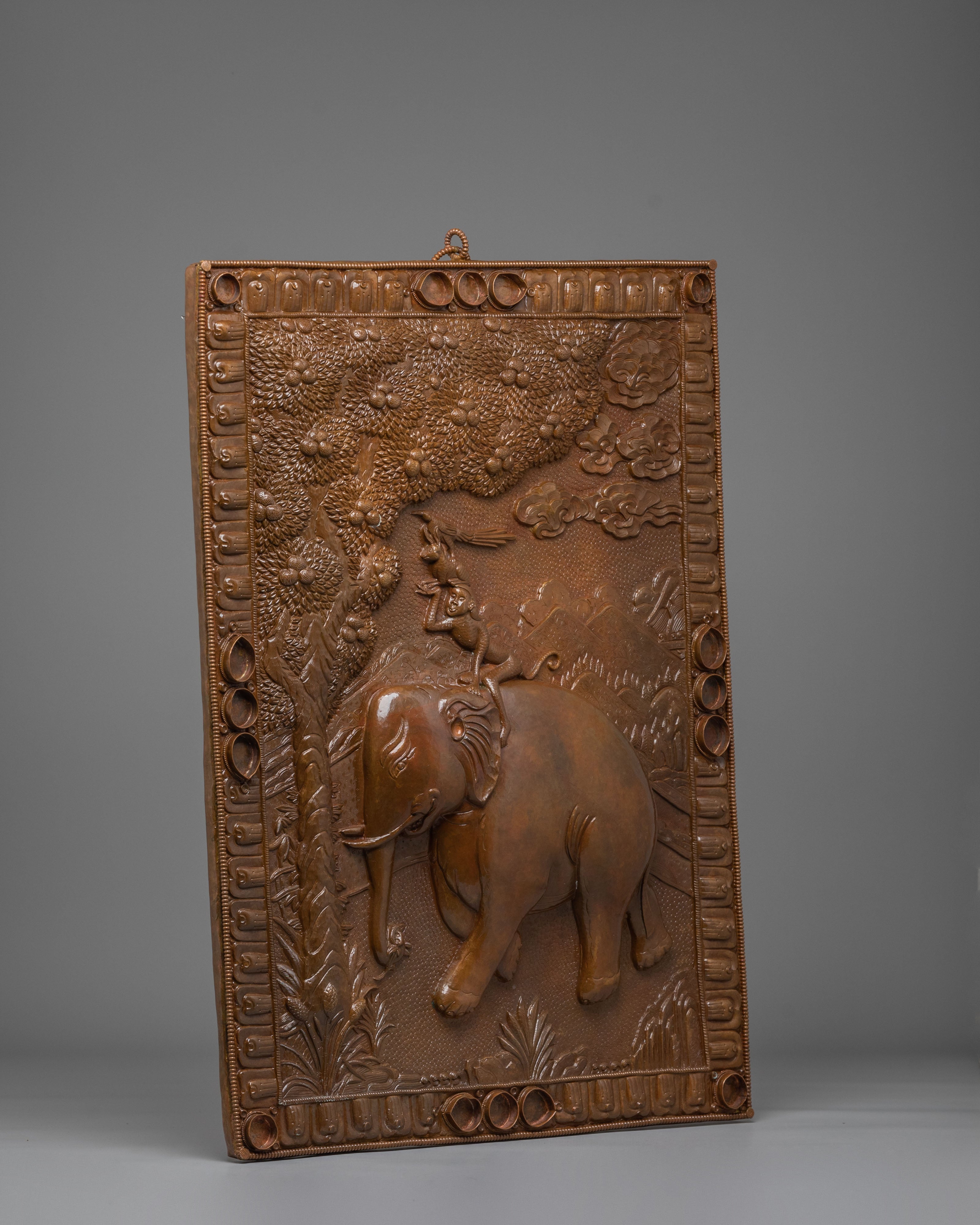 The Four Harmonious Friends Wall Hanging draws inspiration from Tibetan culture, symbolizing unity, peace, and harmony. The depiction of an elephant carrying a monkey on its back emphasizes the values of cooperation and mutual respect. These values are reflected through the artistic motif, where the creatures live in balance, symbolizing the interconnectedness of all beings. The oxidized copper finish enhances the artwork's richness and depth, creating an aesthetic that transforms any space into a sanctuary of peace.