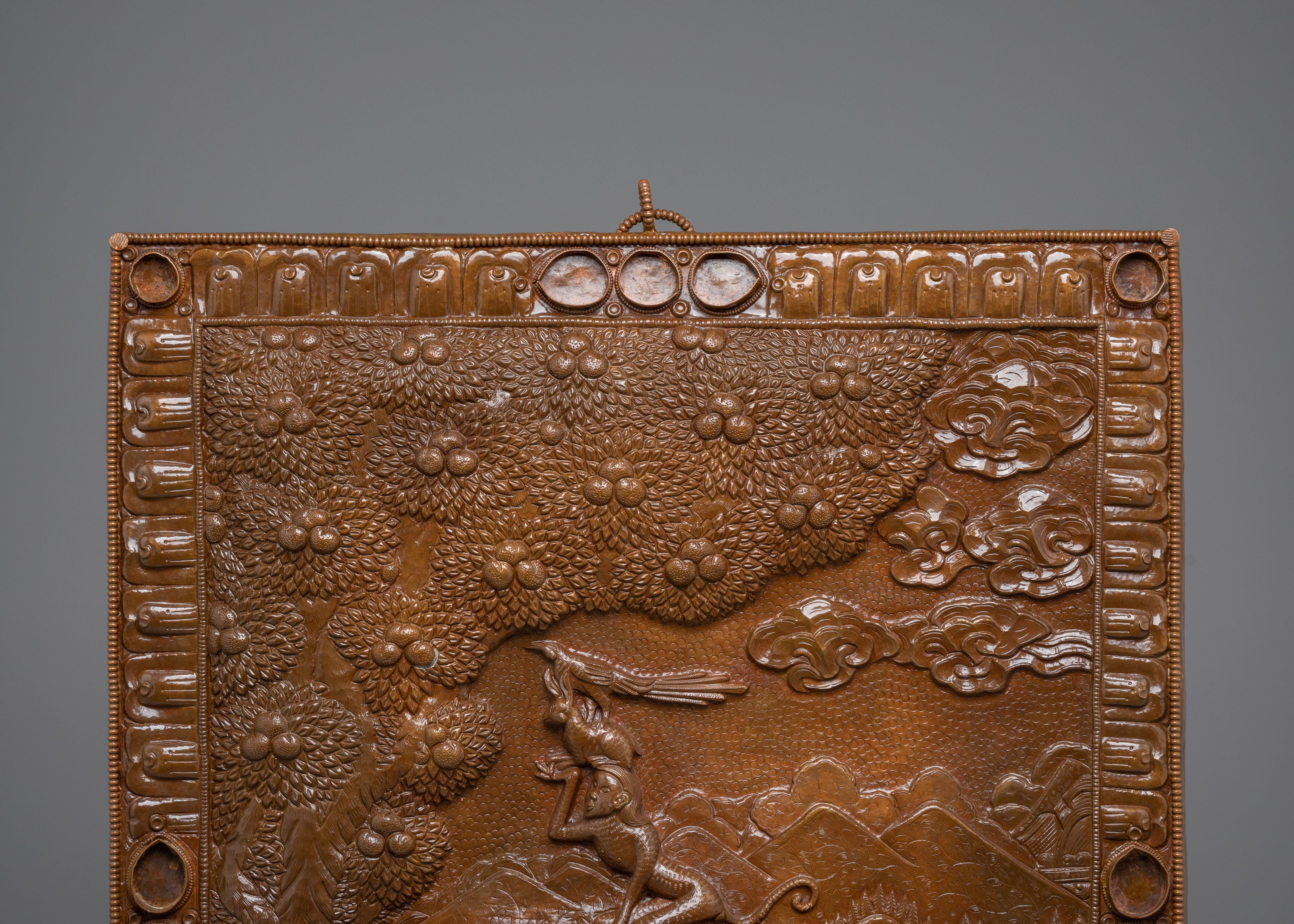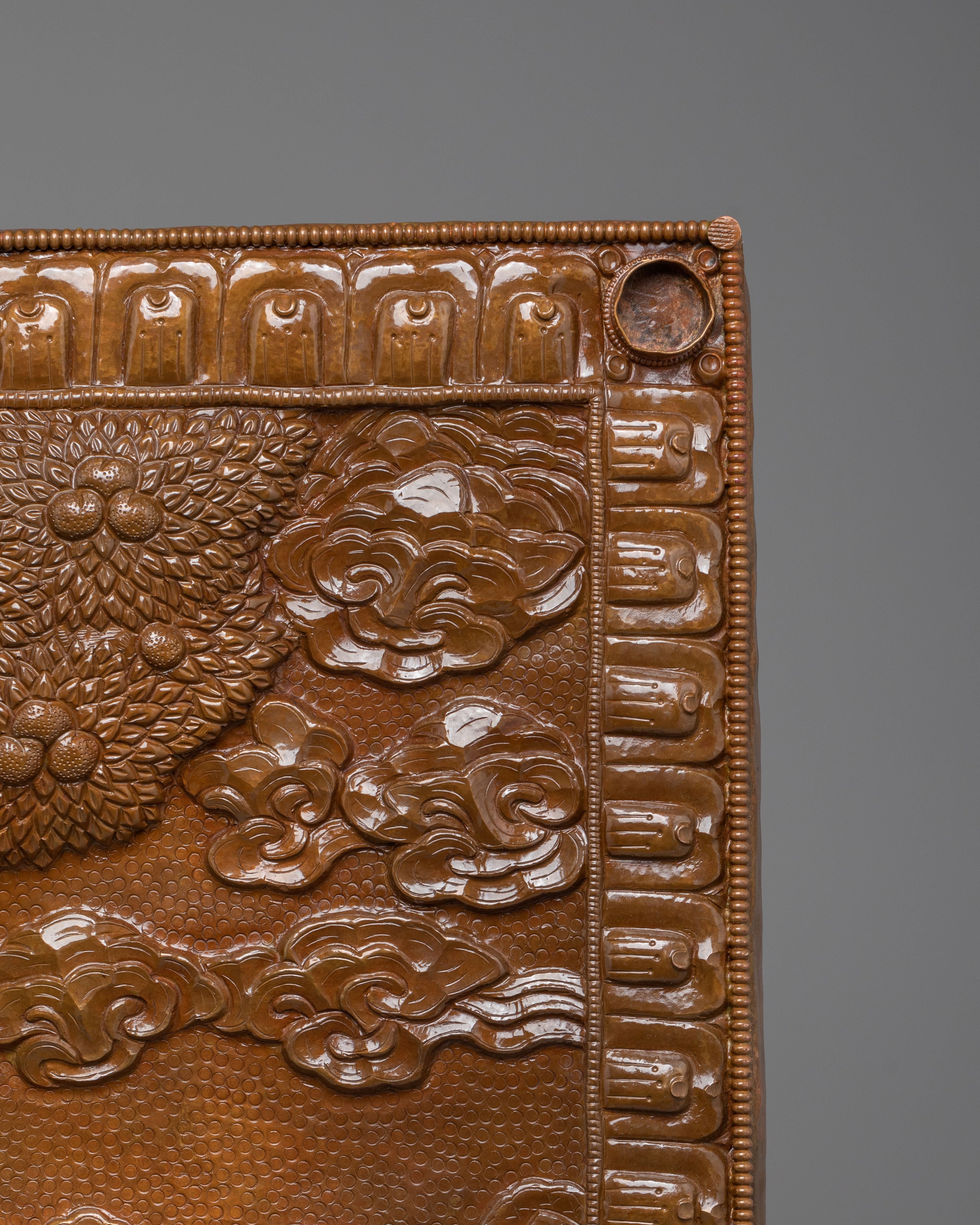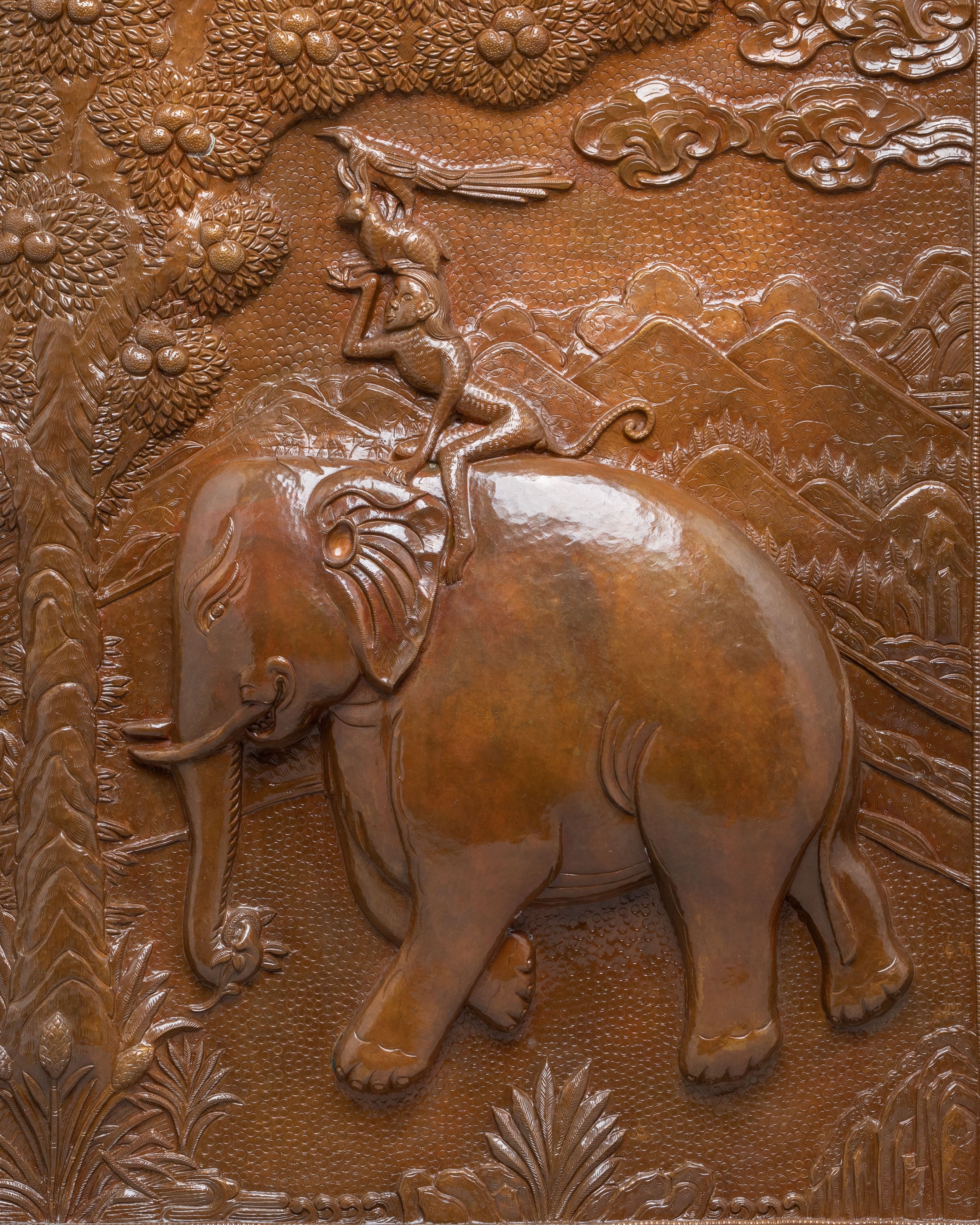 The Four Harmonious Friends Wall Hanging draws inspiration from Tibetan culture, symbolizing unity, peace, and harmony. The depiction of an elephant carrying a monkey on its back emphasizes the values of cooperation and mutual respect. These values are reflected through the artistic motif, where the creatures live in balance, symbolizing the interconnectedness of all beings. The oxidized copper finish enhances the artwork's richness and depth, creating an aesthetic that transforms any space into a sanctuary of peace.